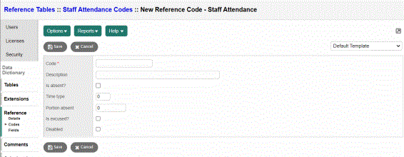 3. On the Options menu, click Add. The New Reference Code page appears.