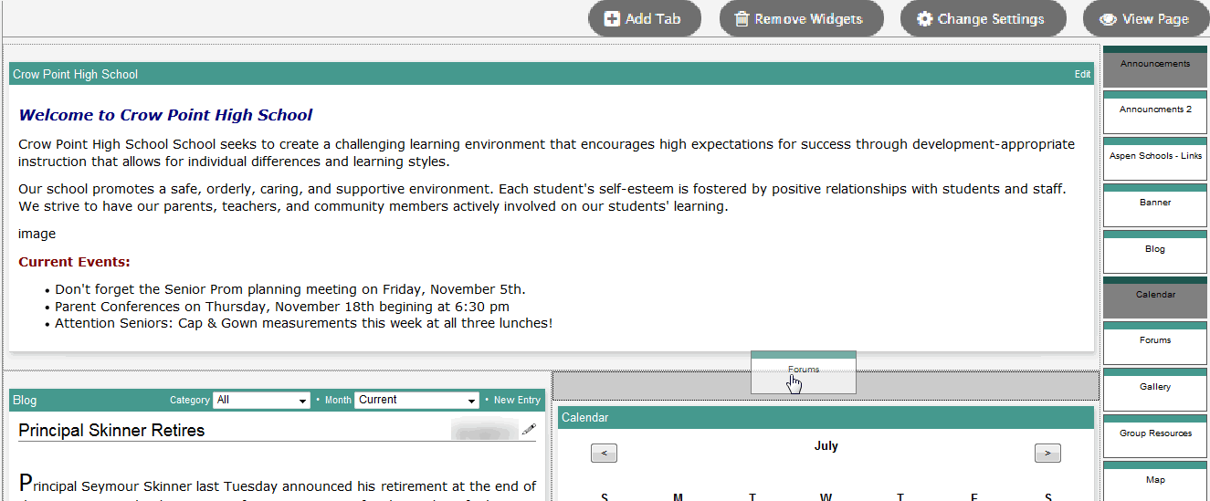 Once you have created a Page and added members, you are ready to add widgets. Widgets include banners, blogs, group resources, and surveys.