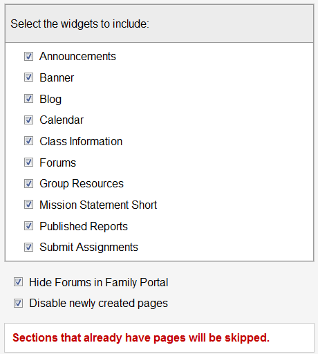 Aspen system administrators can mass-create class pages for use by teachers, students, and parents based on the school's master schedule. For example, administrators can create all of the English department Pages at once.