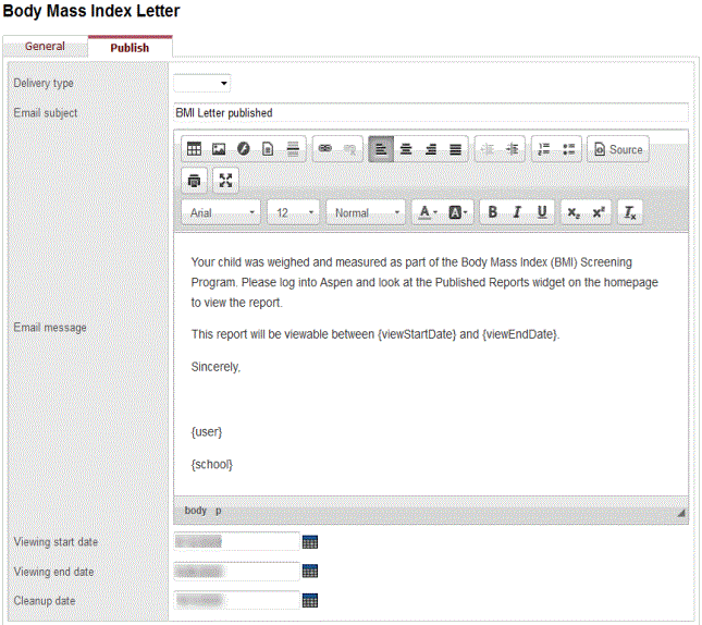 1. Access the report that you want to publish (for example, go to the Health view, Student tab, Reports > Body Mass Index Letter). The appropriate pop-up appears.