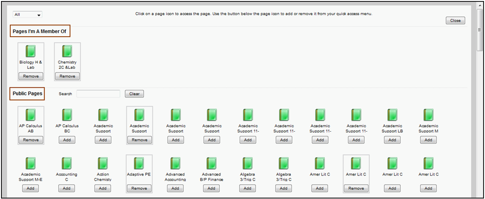 Note: You can browse public Pages and add them to your Quick Access menu, but this does not mean that you are a member of the group. For example, if your school Page is a public Page, you would be able to read a blog that is posted but not create your own entries.
