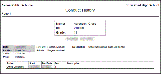 Run the Conduct History report to view all conduct incidents entered for a single student within a date range: