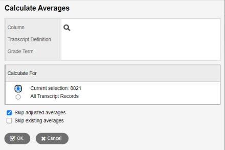 Use the Calculate Averages option to perform average calculations. You can run calculations on transcript columns defined as Other Average or Final Average in the transcript definition. The system bases the calculation on the formula you upload in the 'Grade calculation' field on the transcript column definition.