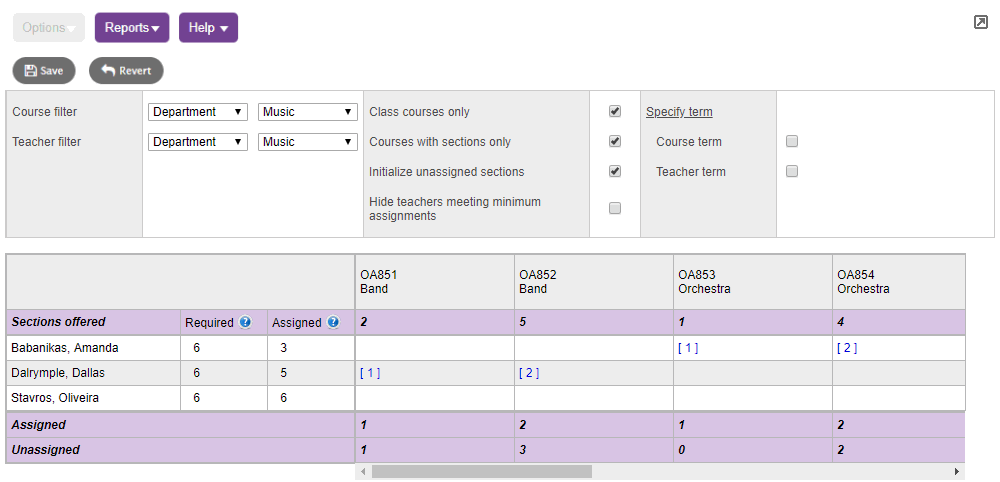 After you finish entering section assignments, click Save. The system creates or updates sections with teachers and terms you specify on the grid.