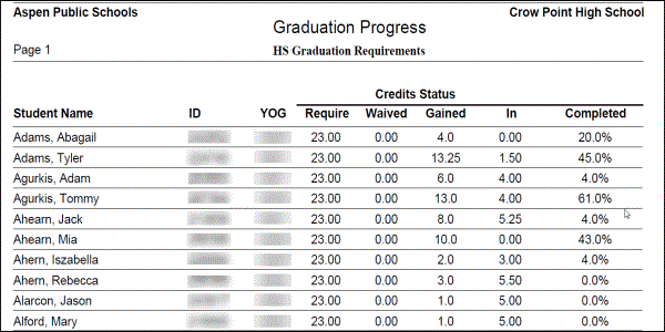 Run the Graduation Progress report to view a list of students and their status in completing graduation requirements: