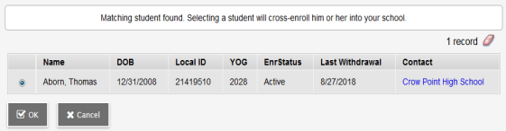 3. A pop-up lists the student’s name, some demographic information, and contact information for the student’s primary school. Click OK.