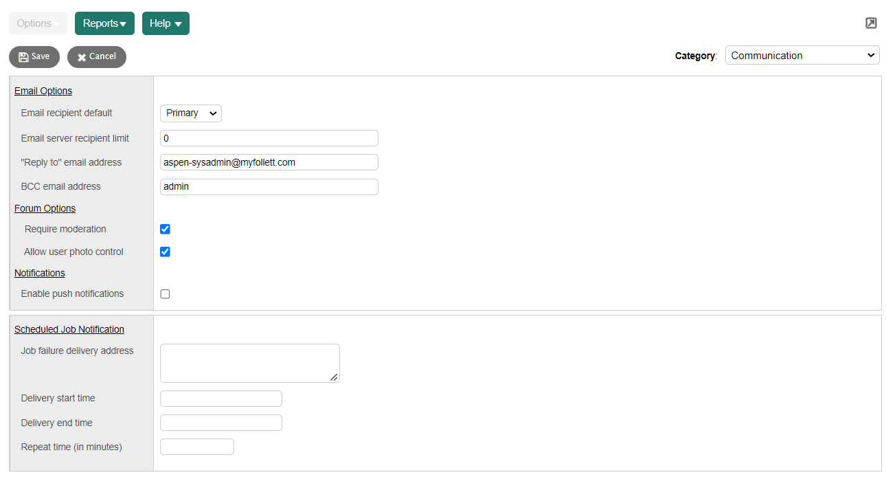Set district communication preferences to connect your users to a mail server. Also, set options regarding forum moderation, photos and scheduled job notifications.
